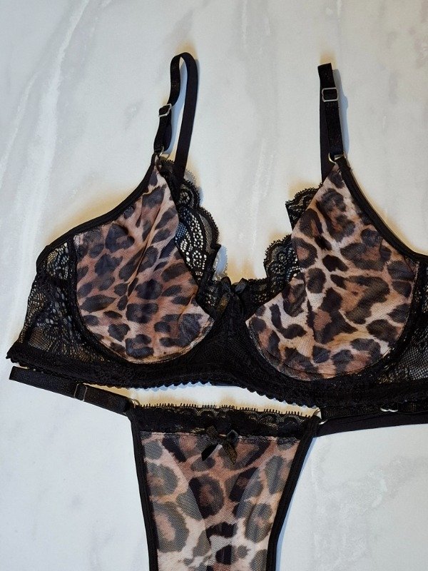 Conjunto de corpiño de microtul con diseño de animal print y detalles de puntilla, con arco entero y todas las argollas y correderas de material ZAMAK.