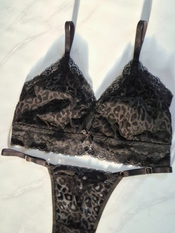 Conjunto de corpiño de microtul con diseño de animal print y detalles de puntilla, todas las argollas y correderas de material ZAMAK.